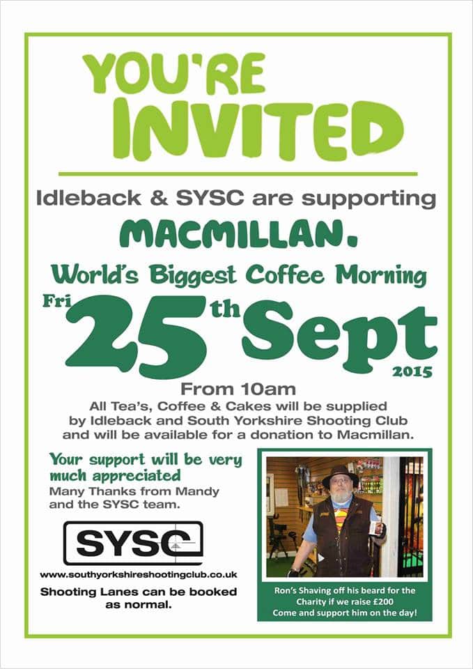 Macmillan Coffee Morning http://southyorkshireshootingclub.co.uk/macmillan-coffee-morning http://southyorkshireshootingclub.co.uk/macmillan-coffee-morning#respond Thu, 03 Sep 2015 10:39:29 +0000 http://southyorkshireshootingclub.co.uk/?p=1659 You’re all invited to our Macmillan coffee morning at the Shooting Range.